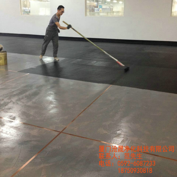 導電銅網層:   待底涂固化后,在上面按3m見方交叉鋪設銅網并使其周邊連接   廠房地線。然后將導電底油用滾筒或鏝刀在鋪設銅網的地面上反復鏝涂兩次,形成導電層。