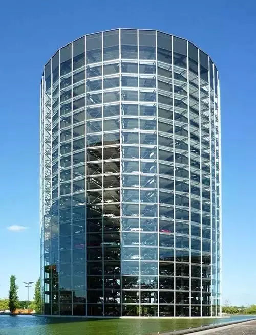 這其實是大眾德國的沃夫斯堡的停車場。兩幢圓柱形汽車塔高20層42米,每幢塔樓可以存放400輛大眾汽車。